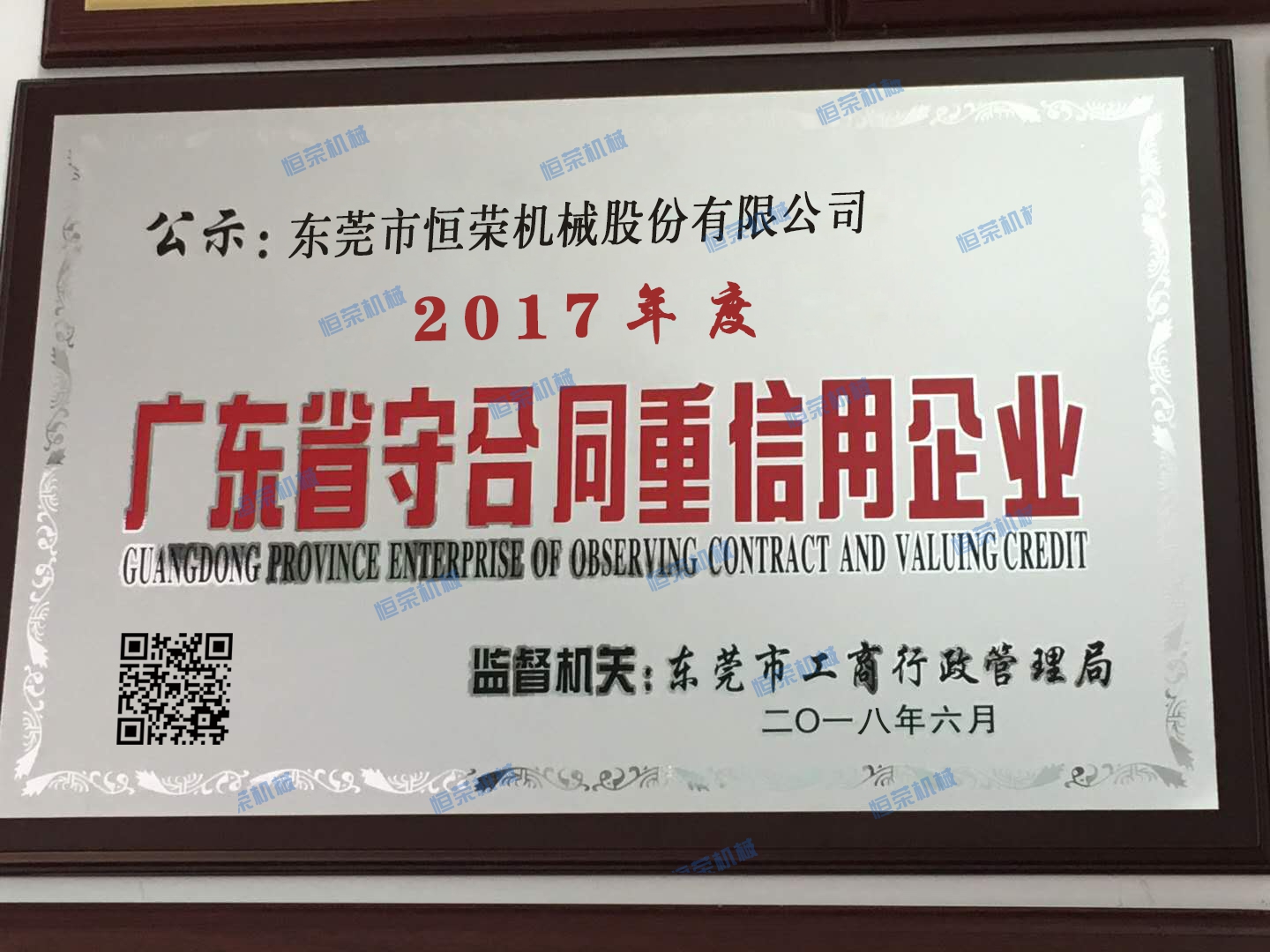 榮獲2017年度東莞市“守合同重信用”企業(yè)稱號(hào),表明了公司誠(chéng)信建設(shè)得到了政府主管部門和社會(huì)各界的高度認(rèn)可,彰顯了公司誠(chéng)信立企的核心價(jià)值觀,展示了公司重信用的良好形象。