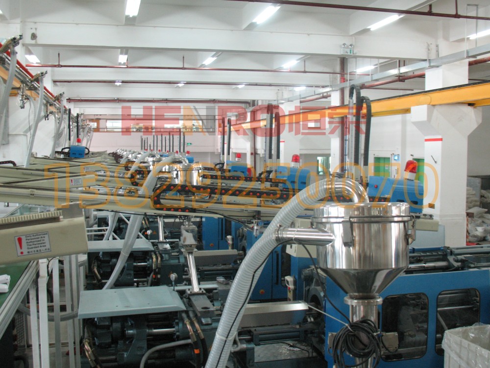 恒榮中央供料系統采用一臺機一根管,密封式回路設計方式,保證整個系統運行穩定,無塑膠回潮、堵料現象發生。它配合中央干燥機(除濕機)系統使用,可使干燥空氣對原料進行再次干燥,防止干燥后的塑膠回潮,同時在每個輸送循環后對輸送管進行清理,確保管道內沒有殘料。在避免原料回潮的同時也保證加入注塑機中原料一致性,在真空負壓同進作用下,原料中原有的粉塵經過過濾器(集塵器)系統濾出,有利于提高產品質量。